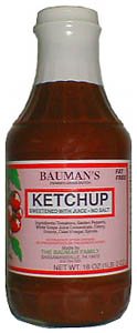 3 18 ounce bottle of Bauman's Ketchup is prepared in the delicious heart of the harvest, as clean fresh fruit is cooked to a naturally smooth spread. No Pectin or thickeners are added. Nor do they ever use preservatives or additives in their products. Just the natural goodness of fruits and spices. Read more...